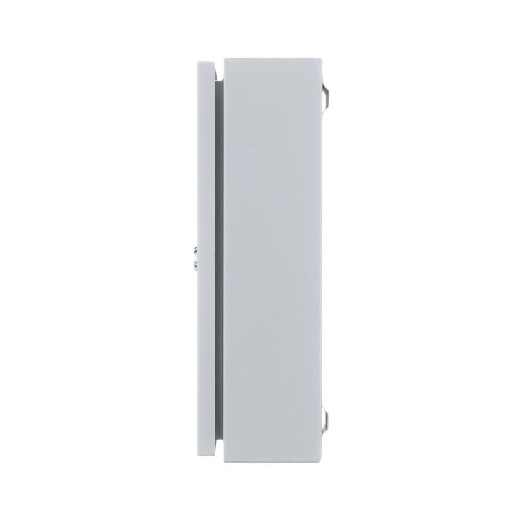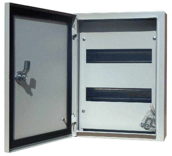 Щит распределительный серии ЩРН DEKraft; навесной; номинальный ток до 125 А; исполнение – 24 мод. х 18 мм, 2 ряда; ВхШхГ - 400х300х120 мм; материал – сталь; цвет - серый (RAL 7035); степень защиты – IP54. Щиты ЩРН имеют встроенные DIN-рейки для модульной аппаратуры, элементы крепления шин N и PE, болты заземления на дверце и на корпусе, дверь с замком и ключом. Доступ к токопроводящим частя м закрыт съемной фальшпанелью. Ввод кабелей для всех щитов осуществляется сверху или снизу.