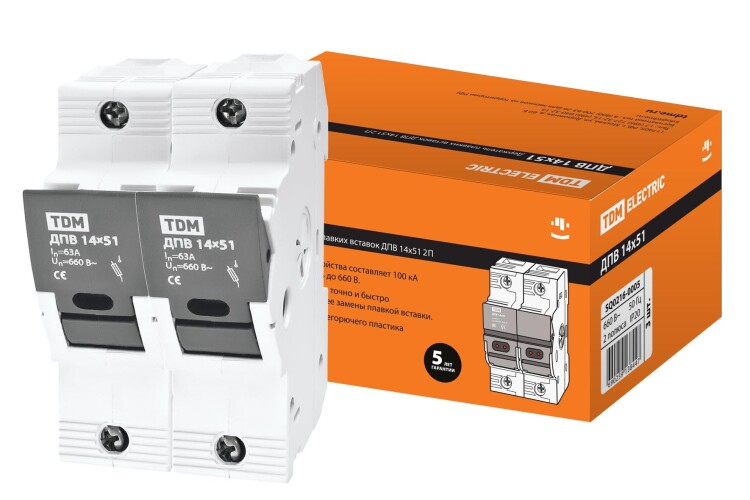 Применение:Вводно-распределительные устройства (ВРУ).Шкафы и щиты управления. Материалы:Корпус и детали аппарата выполнены из пластика, не поддерживающего горение.что предотвращает их окисление в процессе эксплуатации.Контактная группа держателя плавких вставок выполнена из электротехнической меди.Преимущества:которые в случае срабатывания плавкой вставки указывают на устройство, где произошло срабатывание.с высокой номинальной отключающей способностью 100 кА.Обеспечение видимого разрыва для проведения работ на линии.стоимость новой плавкой вставки гораздо ниже автоматического выключателя.позволяет быстро среагировать на внештатную ситуацию.полной защиты (gG) защита как от токов КЗ, так и от токов перегрузки;быстродействующих (aR) защита полупроводниковых приборов от токов короткого замыкания (для включения непосредственно в цепь силового электрода защищаемого диода, тиристора, транзистора). Назначение:(в т. ч. и с большими пусковыми токами двигатели и т. д.) от перегрузок и коротких замыканий. Упаковка:ДПВ 10х38 1П по 12 шт.ДПВ 10х38 2П по 6 шт.ДПВ 10х38 3П по 4 шт.ДПВ 14х51 1П по 6 шт.ДПВ 14х51 2П по 3 шт.ДПВ 14х51 3П по 2 шт.ДПВ 22х58 1П по 6 шт.ДПВ 22х58 2П по 3 шт.ДПВ 22х58 3П по 2 шт.ПВЦ 10x38 по 20 шт.ПВЦ 14х51 по 10 шт.ПВЦ 22х58 по 5 шт.Руководство по эксплуатации - 1 шт. на групповую упаковку Паспорт - 1 шт. на групповую упаковку
