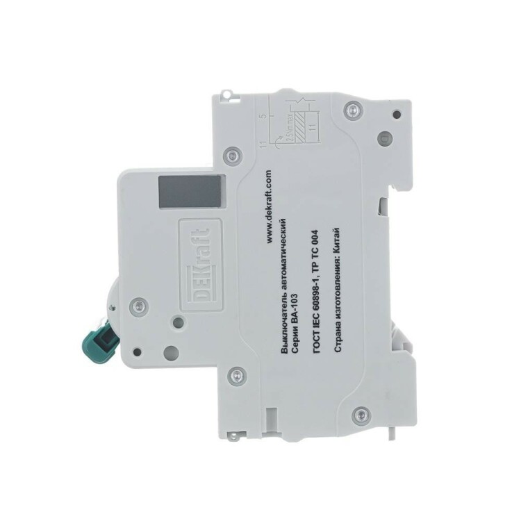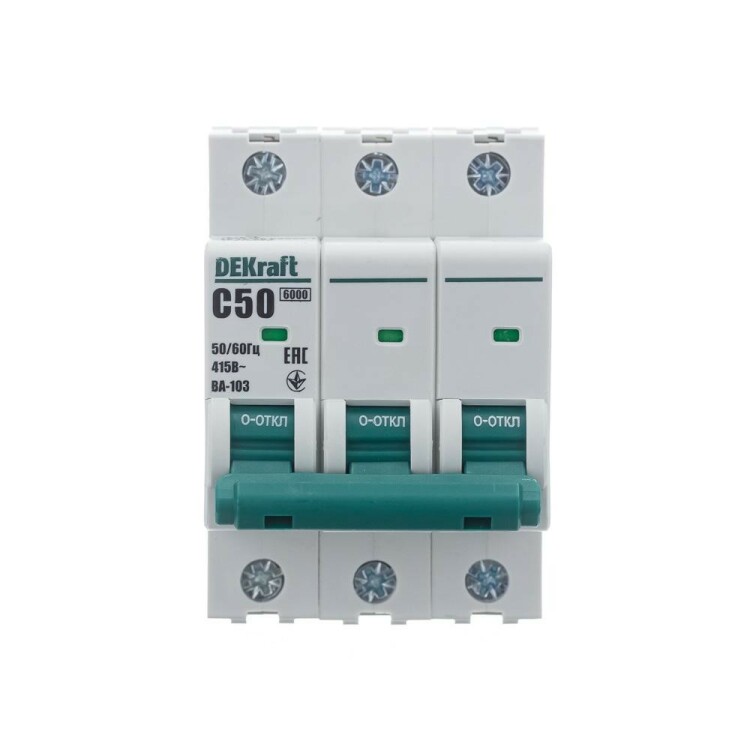 Автоматический выключатель серии ВА-103 NEW DEKraft; 3P; номинальный ток 50 А; характеристика C; отключающая способность 6 кА, что позволяет использовать аппараты в качестве вводных. 5 монолитных заклепок повышают прочность корпуса аппарата. Окошко-индикатор всегда показывает состояние контактов вне зависимости от положения рукоятки управления. Боковые каналы охлаждения повышают стабильность работы при высоких температурах окружающей среды. Есть возможность установки дополнительных аксессуаров с левой стороны устройства. Аппарат на 100% совместим с корпусами и оболочками DEKraft, Systeme Electric.