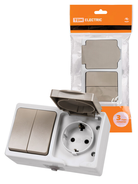 Применение:Бытовые помещения с повышенной влажностью (ванные, санузлы и т.д.).Производственные помещения (мастерские, цеха и т.д.)Наружная установка вне помещений. Материалы:Корпус устройств выполнен из самозатухающего АБС-пластика и обеспечивающего прочность, термостойкость изделий и устойчивость к воздействию солнечных лучей.Контакты розеток выполнены из высокоупругой фосфористой бронзы, обеспечивающей надежный контакт и пожаробезопасность на протяжении всего срока службы изделий.Металлокерамические (AgNi) контакты выключателей, получаемые методом спекания смеси их порошков, позволяют сочетать высокую дугостойкость с хорошей проводимостьюВинты и пружины откидной крышки выполнены из нержавеющей стали.Преимущества:Быстрозажимные клеммы механизма позволяют автоматически регулировать усилие прижима проводника, не позволяя ему просаживаться.Герметичные съемные вводы с двух сторон дают возможность подключения как сверху, так и снизу.Заглубленные пазы для крепления изделия к поверхности обеспечивают класс изоляции II.К каждому изделию в яркой индивидуальной упаковке со стикером, на который нанесена вся необходимая информация о изделии и штрихкод EAN-13, прилагается паспорт с подробной инструкцией по монтажу Назначение:Подключение бытовых нагрузок к сети переменного тока и управление сетями освещения в условиях повышенной влажности и пылезагрязненности. 0: