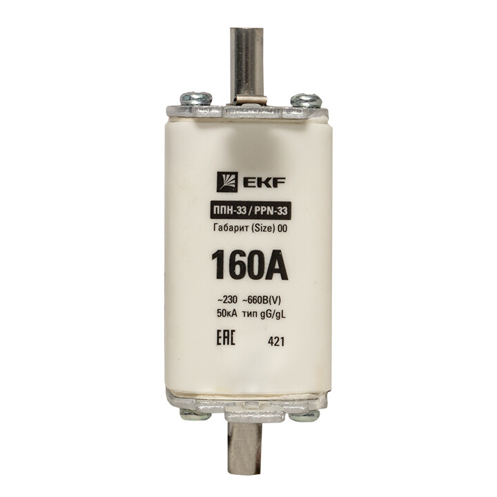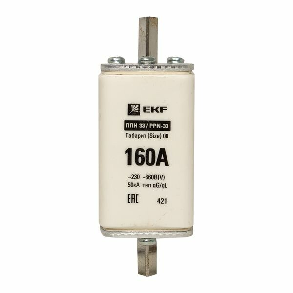 Плавкая вставка ППН-33 160/160А габарит 00 EKF. Предохранители плавкие ППН EKF, укомплектованные плавкими вставками типа gG/gL, предназначаются для защиты кабельных линий и промышленных электроустановок от токов перегрузки и короткого замыкания. Предохранители применяются в электрических сетях переменного тока частотой 50 Гц с напряжением до 660В. Применяются для крепления в распределительных и вводно-распределительных устройствах. Предохранители плавкие ППН могут устанавливаться в основание с держателем, а также в специально предназначенные рубильники. В комплект поставки предохранителей плавких ППН основание с держателем не входит и приобретается отдельно.
