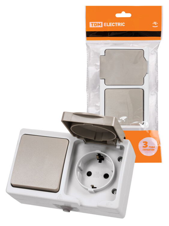 Применение:Бытовые помещения с повышенной влажностью (ванные, санузлы и т.д.).Производственные помещения (мастерские, цеха и т.д.)Наружная установка вне помещений. Материалы:Корпус устройств выполнен из самозатухающего АБС-пластика и обеспечивающего прочность, термостойкость изделий и устойчивость к воздействию солнечных лучей.Контакты розеток выполнены из высокоупругой фосфористой бронзы, обеспечивающей надежный контакт и пожаробезопасность на протяжении всего срока службы изделий.Металлокерамические (AgNi) контакты выключателей, получаемые методом спекания смеси их порошков, позволяют сочетать высокую дугостойкость с хорошей проводимостьюВинты и пружины откидной крышки выполнены из нержавеющей стали.Преимущества:Быстрозажимные клеммы механизма позволяют автоматически регулировать усилие прижима проводника, не позволяя ему просаживаться.Герметичные съемные вводы с двух сторон дают возможность подключения как сверху, так и снизу.Заглубленные пазы для крепления изделия к поверхности обеспечивают класс изоляции II.К каждому изделию в яркой индивидуальной упаковке со стикером, на который нанесена вся необходимая информация о изделии и штрихкод EAN-13, прилагается паспорт с подробной инструкцией по монтажу Назначение:Подключение бытовых нагрузок к сети переменного тока и управление сетями освещения в условиях повышенной влажности и пылезагрязненности. 0: