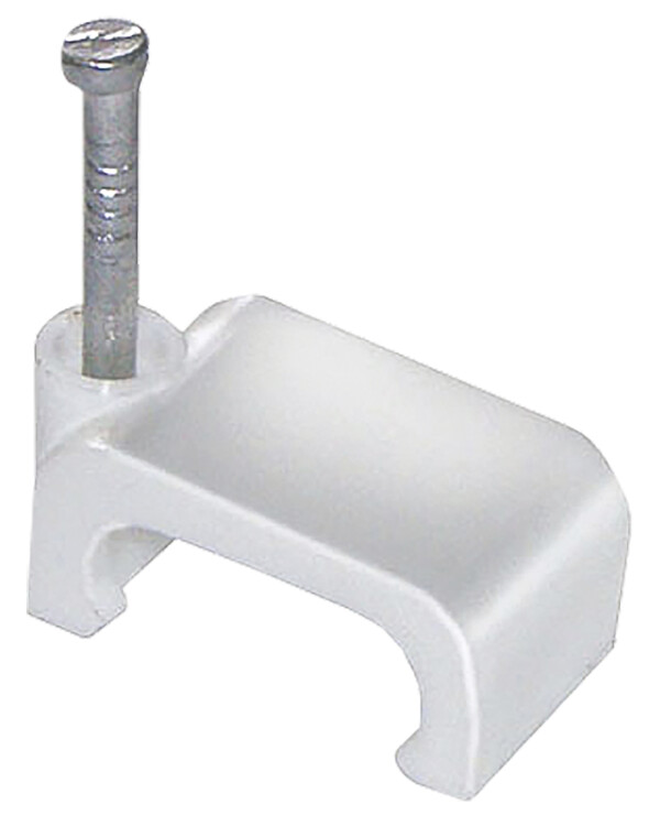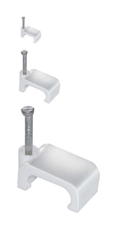 Скоба с гвоздём предназначена для быстрого и надежного крепления плоских кабелей к дереву, прессованному картону, швам кирпичной кладки, к штукатурке, бетону, кирпичу. Изготовлены из гибкого негорючего ударопрочного полипропилена, гвоздь - закаленная оцинкованная сталь.