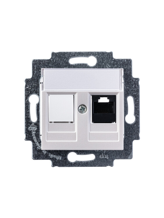 Механизм телекоммуникационной розетки с накладкой. Два гнезда: в одном установлен джек RJ45 категория 5e, во втором - заглушка. С полем для надписи