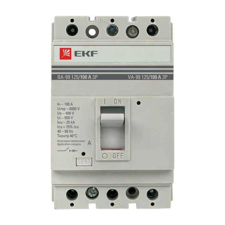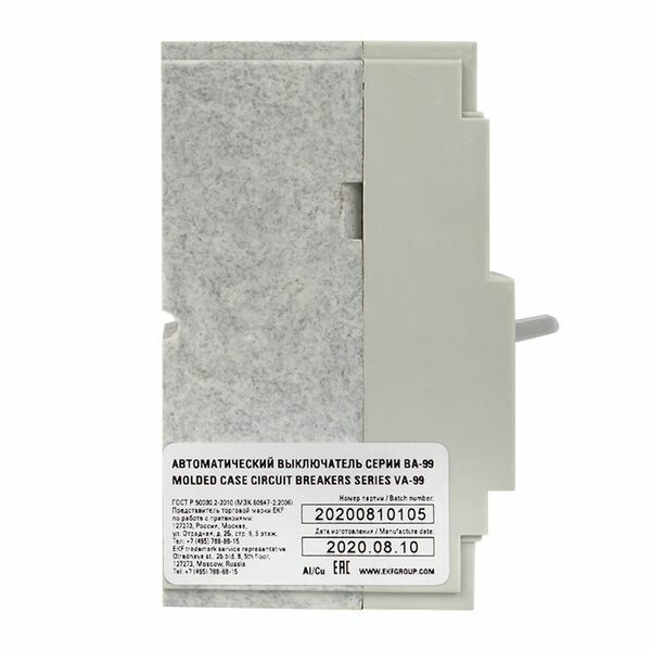Выключатель ВА-99 выполнен в виде моноблока и состоит из основания и крышки с фальшпанелью, в которой имеется окно для рукоятки управления и толкатель кнопки «Тест» - проверки механизма отключения выключателя. Основание выполнено из термостойкой пластмассы, не поддерживающей горение и являющейся несущей конструкцией для присоединительных зажимов, неподвижных и подвижных контактов с системой дугогашения, механизма управления, блока защиты от сверхтоков. Крышка закрывает все подвижные элементы механизма управления и внутренние токоведущие части.