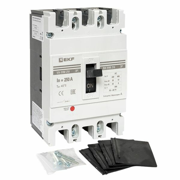 Выключатель ВА-99М выполнен в виде моноблока и состоит из основания и крышки с фальшпанелью, в которой имеется окно для рукоятки управления и толкатель кнопки «Тест» - проверки механизма отключения выключателя. Основание выполнено из термостойкой пластмассы, не поддерживающей горение и являющейся несущей конструкцией для присоединительных зажимов, неподвижных и подвижных контактов с системой дугогашения, механизма управления, блока защиты от сверхтоков. Крышка закрывает все подвижные элементы механизма управления и внутренние токоведущие части.