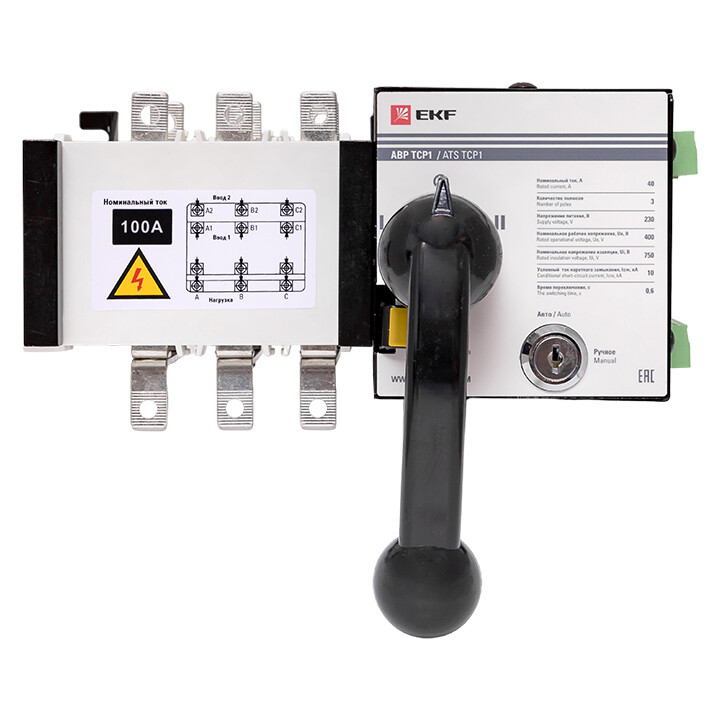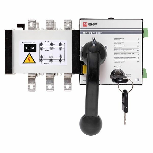 Устройство АВР торговой марки EKF предназначено для обеспечения резервным электроснабжением нагрузки, подключенной к системе электрообеспечения, имеющей основной и резервный вводы. Устройство АВР автоматически подключает резервную линию питания в случае пропадания напряжения на основной линии. Устройство АВР выполнено в виде моноблока и состоит из контактного блока и блока управления. На блоке управления имеется рычаг ручного переключения, замковый механизм перевода в ручной или автоматический режимы управления и запорный механизм, обеспечивающий блокировку переключения устройства АВР. АВР ТСР1 работает только по схеме электросеть-электросеть. Устройство АВР ТСР1 работает по схеме электросеть-электросеть. Для работы в режиме электросеть-генератор нужно подключить ДГУ к соответствующим контактам. Также контроль наличия напряжения осуществляется только по фазе А, не рекомендуется использовать данное устройство при необходимости контроля всех трёх фаз