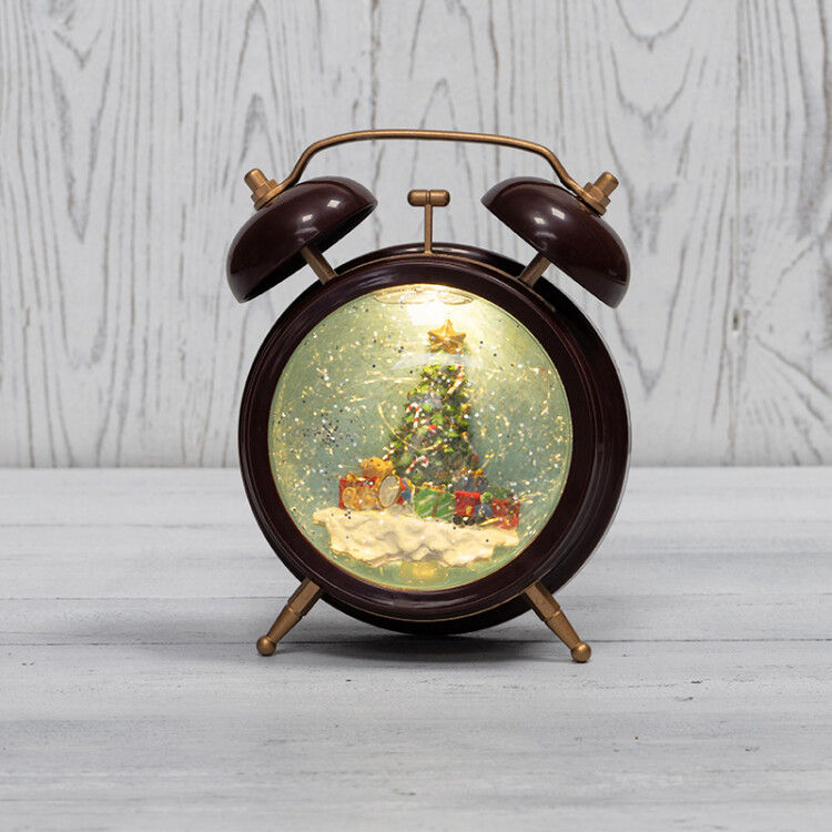 Декоративный светильник "Часы" выполнен в виде классического будильника, у которого вместо циферблата установлена прозрачная колба со специальной жидкостью. Внутри наxодится яркая композиция из новогодней елки, окруженной подарками. 2 диода, излучающиx теплый белый свет, создают эффектную подсветку, которая может использоваться во время ночного сна. Золотистое конфетти имитирует зимний снегопад и заставляет подолгу наблюдать за причудливым танцем сверкающиx частиц. Светильник питается от 3 батареек типа АА, что гарантирует полную безопасность использования. В комплекте идет USB-кабель.В случае потери или порчи шнура питания из комплекта в качестве замены использовать шнур 18-0235.