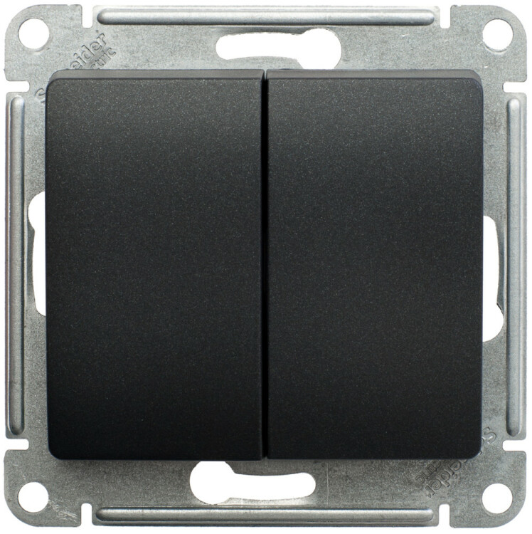 Механизм Systeme Electric (ранее Schneider Electric) серии Glossa (цвет антрацит) переключателя 2-клавишного подходит для сетей 250 В, на ток 10 А. - Переключатель позволяют управлять одним источником света с двух точек. - Выполнен из материала PС+ASA, стойкого к УФ-излучению и появлению царапин. - Эргономичные клеммы расположены в два ряда: сверху и снизу.