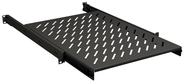 Выдвижные полки крепятся на фронтальные и на задние профили, имеют перфорированную поверхность для обеспечения лучшего охлаждения и отведения теплых воздушных потоков, а за счёт наличия специальных телескопических салазок способны плавно выдвигаться вперед за пределы рабочей плоскости, образованной передней парой 19'' профилей. Данные полки рассчитаны на оборудование, требующее регулярного обслуживания и извлечения из шкафа, но с небольшой общей массой, чтобы избежать его опрокидывание и возможной поломки выдвижного механизма полки.