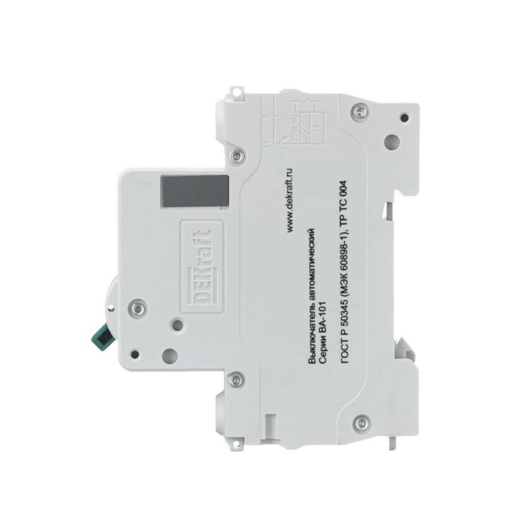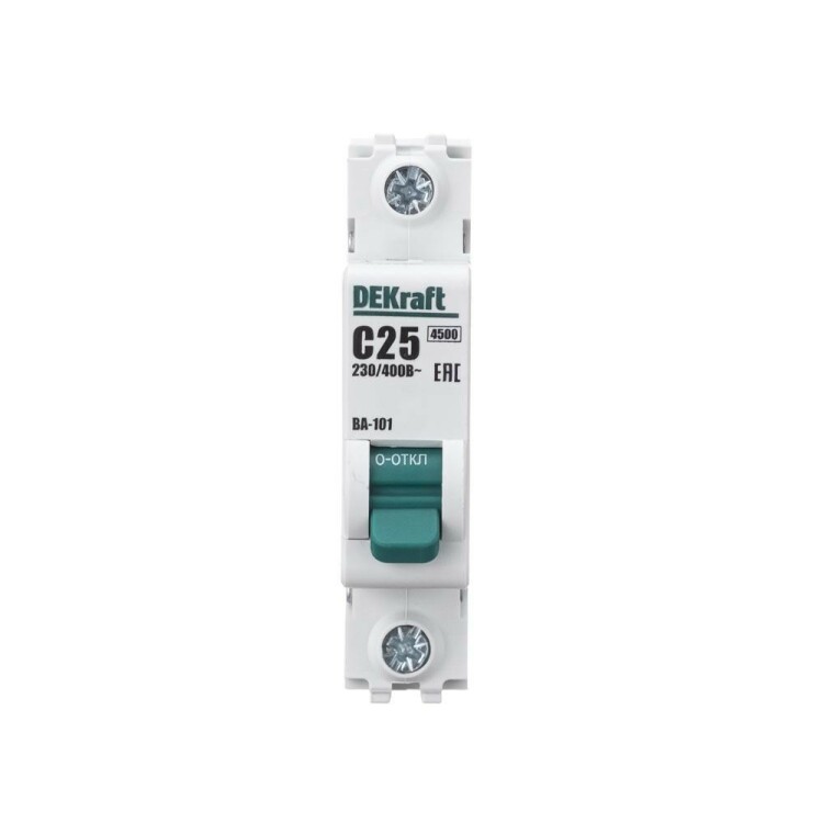 Автоматический выключатель серии ВА-101 Dekraft; 1P; номинальный ток 25 А; характеристика С; отключающая способность 4,5 кА. 5 монолитных заклепок повышают прочность корпуса аппарата. Сплошная лицевая панель обеспечивает безопасность эксплуатации аппарата. Боковые каналы охлаждения повышают стабильность работы при высоких температурах окружающей среды. Есть возможность установки дополнительных аксессуаров с левой стороны устройства. Аппарат на 100% совместим с корпусами Dekraft и Systeme Electric.