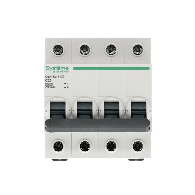 Автоматический выключатель серии City9 Set Systeme Electric, 4-полюсный, номинальный ток 25 А, характеристика С, Icn = 4.5 кА. Применяется в электрических сетях напряжением 400 В. Предназначен для защиты от перегрузок и токов короткого замыкания. Оснащен механизмом «мгновенной коммутации». Ударопрочный корпус из специального пластика с 6 металлическими заклепками. Безопасные клеммы исключают попадание кабелей в заклеммное пространство.