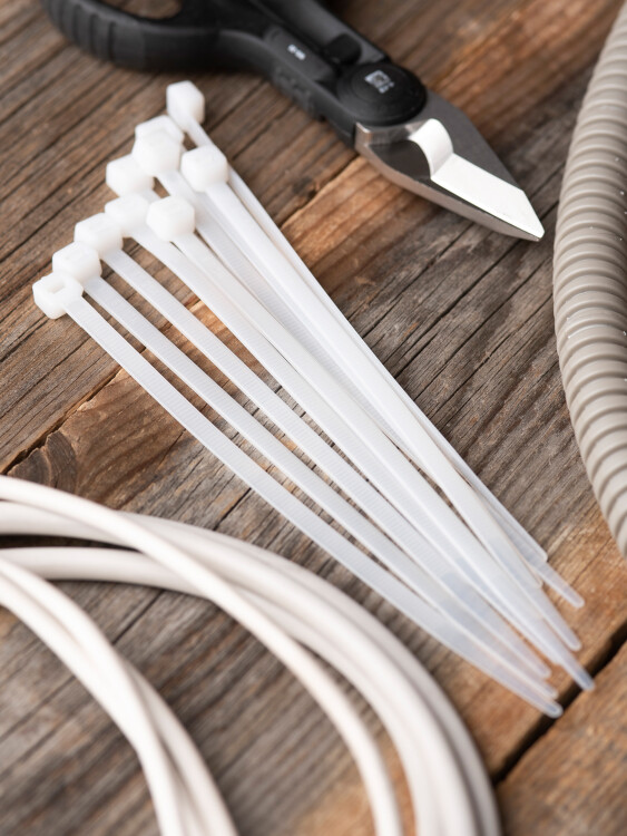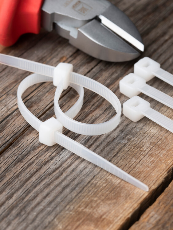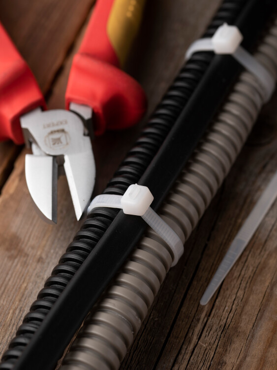 Предназначен для увязки кабелей и проводов в пучок и монтажа кабельных линий и проводников. Ремешок самофиксирующийся, блокирующий механизм. Изготовлен из Nylon 6.6, устойчивого к старению, коррозии, воздействию солей, ультрафиолета, кислот, щелочей, спирта, бензина и масел. При производстве кабельных стяжек черного цвета добавляется угольный порошок, который является одним из наиболее эффективных стабилизаторов. Он улучшает физические свойства продукции в стойкости к погодным условиям и УФ-излучению (прямые солнечные лучи).