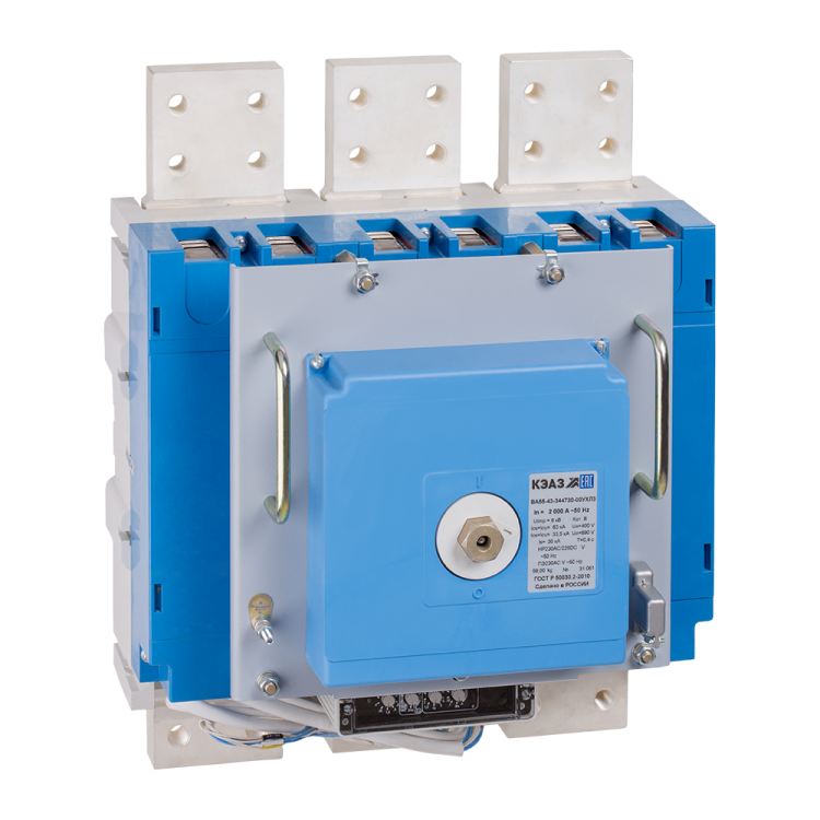 Блочный автоматический 3 полюсны й выключатель переменного тока с предельной коммутационной способностью при переменном токе 63 кА на номинальный ток 2000 А .