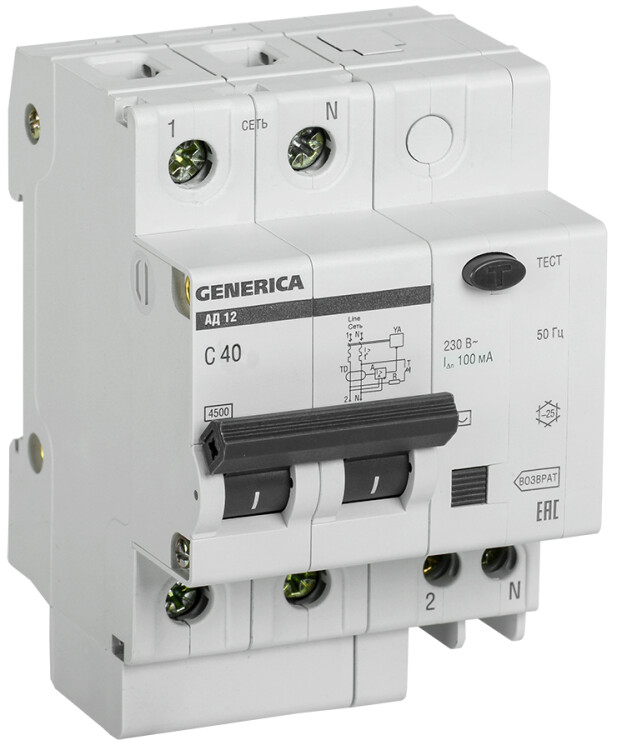 Диф. автомат АД12 2Р 40А 100мА GENERICA