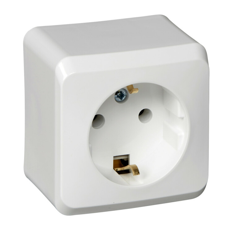 Розетка Systeme Electric (ранее Schneider Electric) ЭТЮД (белый, открытой установки) одноместная с заземлением, без шторок предназначена для применения в сетях до 250В, на ток до 16А. Заземление обеспечивает безопасность при косвенном прикосновении. Она проста в установке и удобна в применении. Сделано в России.