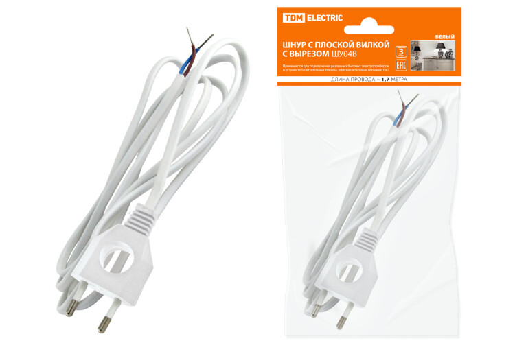 Шнур бра с плоской вилкой с вырезом 1,7м (ШВВП 2х0,75мм2) белый ШУ04 TDM (1/80шт)