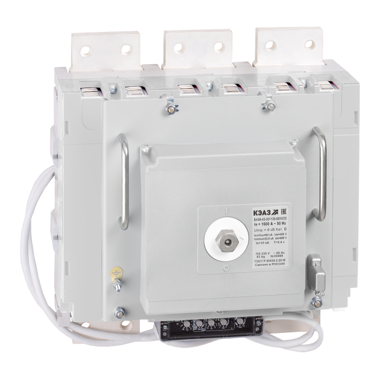 Блочный автоматический 3 полюсный выключатель переменного тока с предельной коммутационной способностью при переменном токе 63 кА на номинальный ток 1600 А .