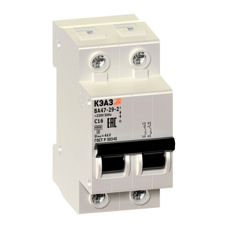 Модульный автоматический 2 полюсный выключатель переменного тока с предельной коммутационной способностью при переменном токе 4.5 кА на номинальный ток 1 А .