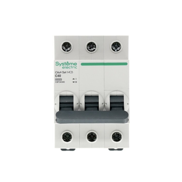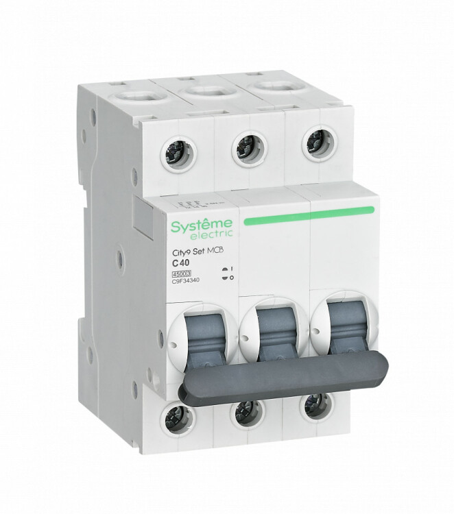 Автоматический выключатель серии City9 Set Systeme Electric, 3-полюсный, номинальный ток 40 А, характеристика С, Icn = 4.5 кА. Применяется в электрических сетях напряжением 400 В. Предназначен для защиты от перегрузок и токов короткого замыкания. Оснащен механизмом «мгновенной коммутации». Ударопрочный корпус из специального пластика с 6 металлическими заклепками. Безопасные клеммы исключают попадание кабелей в заклеммное пространство.