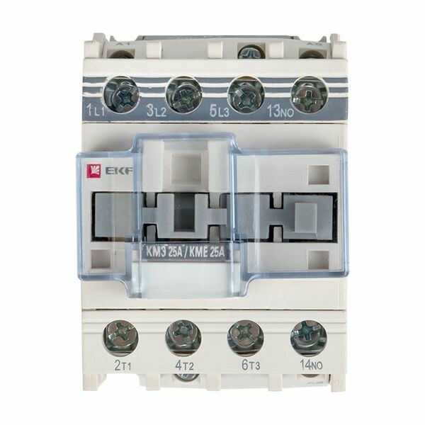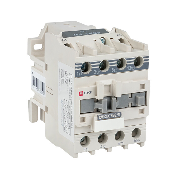 Контакторы КМЭ EKF PROxima состоят из корпуса, закрепленных в нем неподвижных контактов, подвижных контактов, которые закреплены в подвижной части магнитной системы. Неподвижная часть магнитной системы закреплена жестко в корпусе КМЭ. Пружина препятствует смыканию контактов. При подаче напряжения на катушку управления в магнитной системе контактора возникает магнитное поле, которое, преодолевая сопротивление пружины, смыкает магнитную систему и замыкает контакты. При отключении напряжения с катушки управления пружина размыкает контакты. Возможна коммутация алюминиевым и медным проводом.