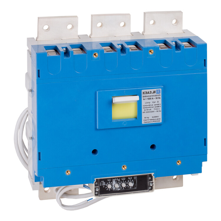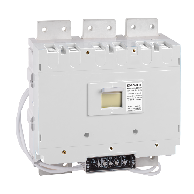 Блочный автоматический 3 полюсный выключате ль переменного тока с предельной коммутационной способностью при переменном токе 63 кА на номинальный ток 1600 А .