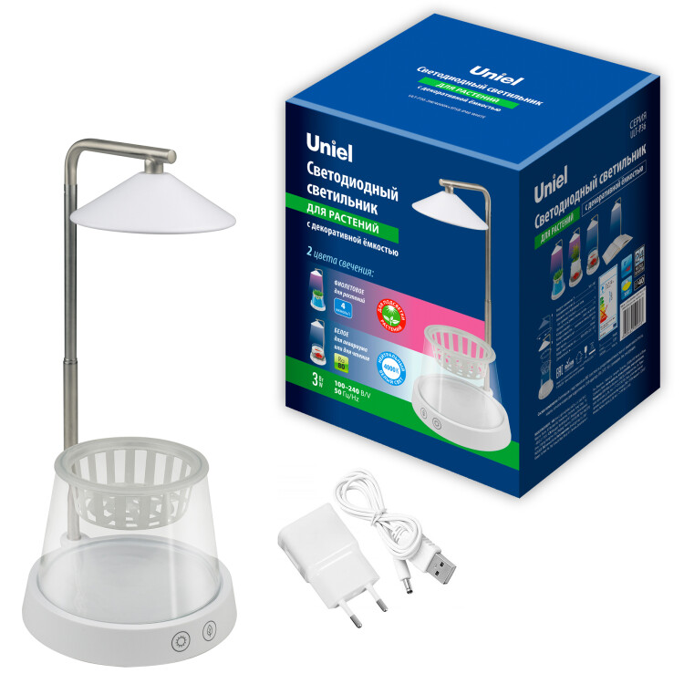 ULT-P36-3W/4000K+SPSB IP40 WHITE Светильник для растений светодиодный, с подставкой и декоративной емкостью. Белый свет(4000K) + cпектр для рассады и цветения. TM Uniel