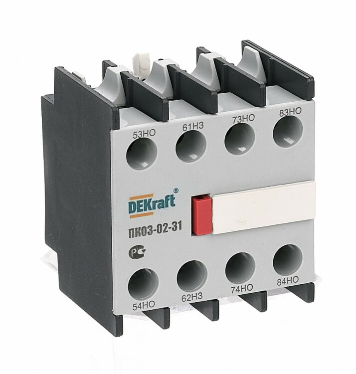 Приставка контактная серии ПК-03-02 для контакторов КМ-103 DEKraft; кол-во контактов - 3НО+1НЗ; ном.ток 10 А; ном.напряжение до 690 В; установка с лицевой стороны; степень защиты IP20. Приставки контактные предназначены для увеличения количества вспомогательных контактов контактора. Контактные приставки механически соединяются с контакторами и фиксируются при помощи защелки. Приставка подходит для использования с контакторами других производителей.