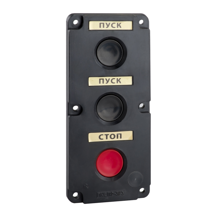 Кнопочный пост шириной 80 мм, высотой 180 мм и глубиной 70 мм, в котором толкателем выступает 2 черных и красная кнопка .