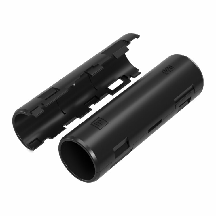 Муфта разборная позволяет соединять гофрированные и гладкие трубы различных типоразмеров без использования специальных инструментов, как при прокладке проложенной кабеленесущей трассе вновь, так и по ранее смонтированной системе труб, в том числе с переходом с гофрированной трубы на гладкую одного типоразмера.