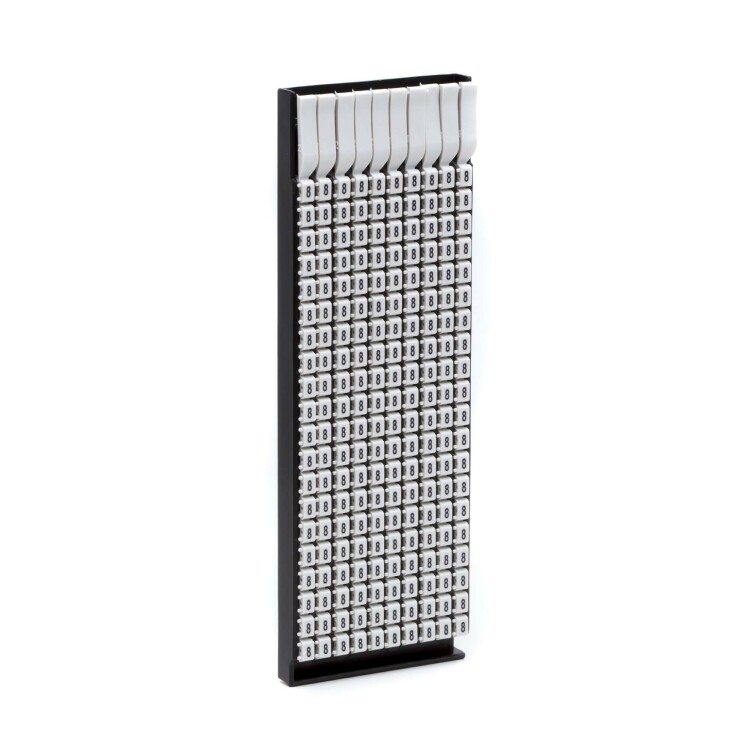Ручная маркировка системы MARK 3 для маркировки проводов без разъединения электрической цепи из полиамида 6.6. Температура эксплуатации от –40 до +100 °С. Боковые штифты надежно фиксируют соединение друг с другом и позволяют добиться точного выравнивания маркеров. Цвет маркеров соответствует международной кодировке. Символ "8" черным цветом на сером маркере для сечения провода 4-6 мм2. 160 маркеров в упаковке.