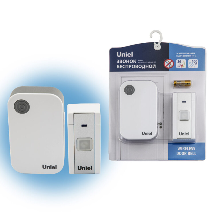 UDB-013W-R1T1-36S-100M-WH Звонок беспроводной. 36 мелодий. Радиус действия 100м. Блистер. Белый. ТМ Uniel