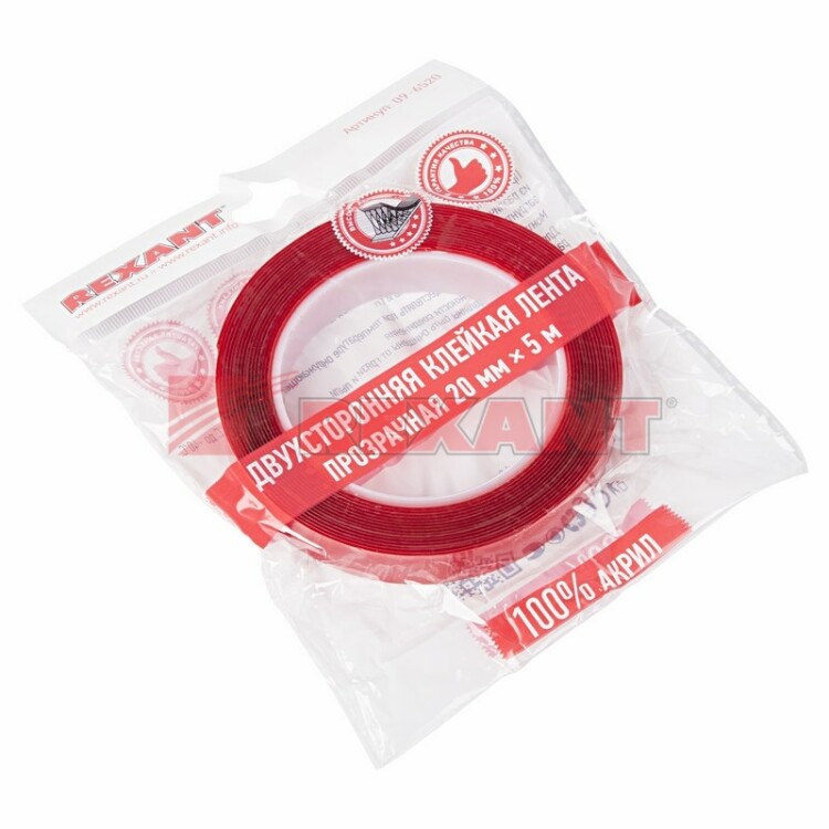 REXANT Двухсторонний скотч прозрачный 100% акрил, защитная пленка красного цвета 20мм 5м