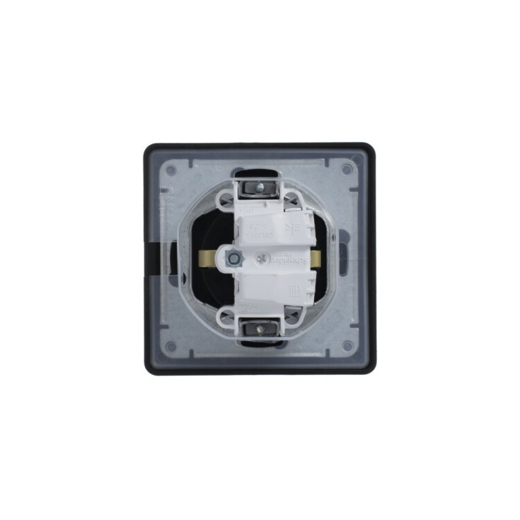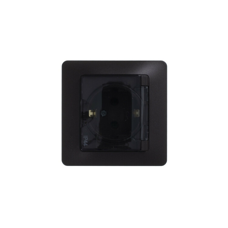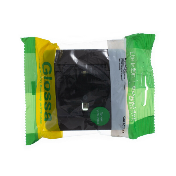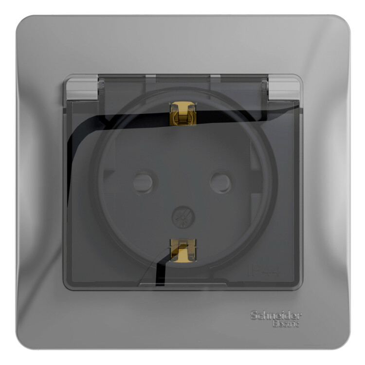 Розетка Systeme Electric (ранее Schneider Electric) серии Glossa (в сборе, цвет алюминий) одинарная с заземлением, шторкам и и крышкой подходит для сетей 250 В, на ток 16 А.