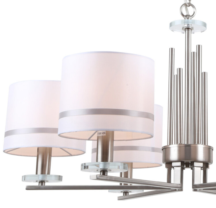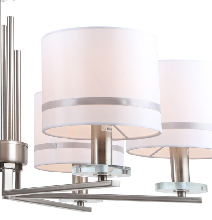 Подвесная люстра из серии Chart имеет металлическую арматуру, гальванизированную в цвет никеля и декорирована железными стержнями в цвет арматуры. Текстильные абажуры белого цвета с термостойким акрилом внутри отделаны кантом в цвет арматуры. Декоративные розетки выполнены из прозрачного стекла.
