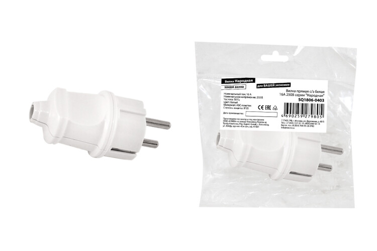 НАРОДНАЯ Вилка с/з прямой вывод 16А 250В белая TDM (30/300шт)