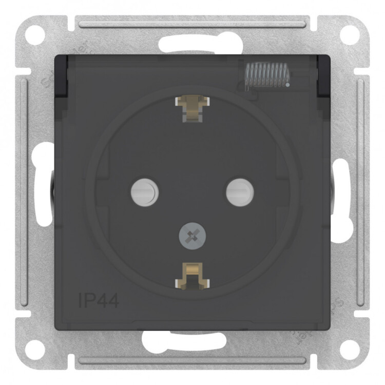Механизм Systeme Electric (ранее Schneider Electric) серии AtlasDesign Aqua (цвет карбон) розетки одинарной с заземлением, што рками и крышкой подходит для сетей 250 В, на ток 16 А.