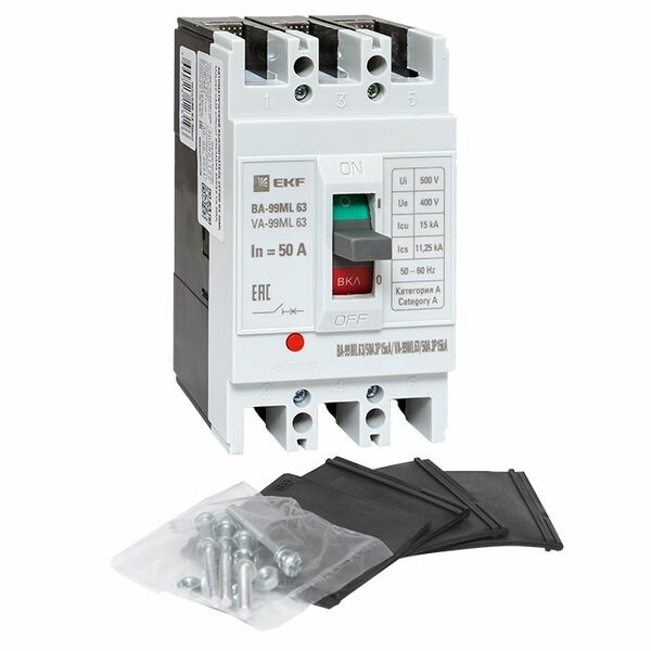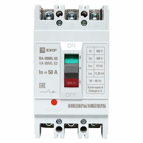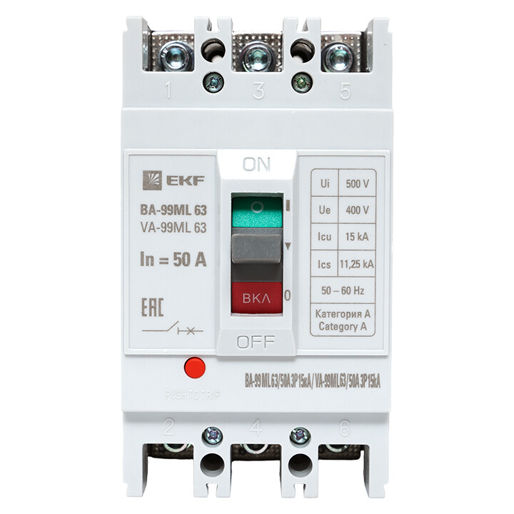 Выключатель ВА-99 выполнен в виде моноблока и состоит из основания и крышки с фальшпанелью, в которой имеется окно для рукоятки управления и толкатель кнопки «Тест» - проверки механизма отключения выключателя. Основание выполнено из термостойкой пластмассы, не поддерживающей горение и являющейся несущей конструкцией для присоединительных зажимов, неподвижных и подвижных контактов с системой дугогашения, механизма управления, блока защиты от сверхтоков. Крышка закрывает все подвижные элементы механизма управления и внутренние токоведущие части.
