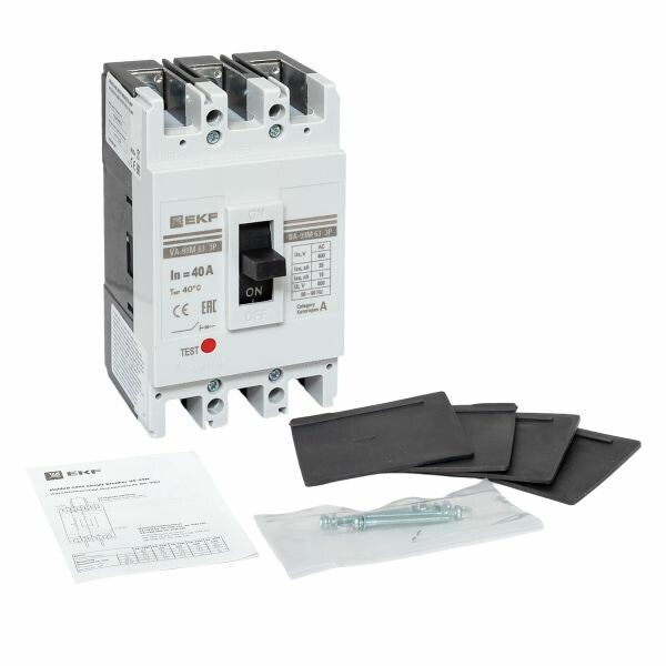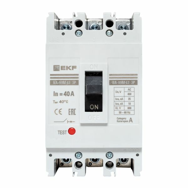 Выключатель ВА-99М выполнен в виде моноблока и состоит из основания и крышки с фальшпанелью, в которой имеется окно для рукоятки управления и толкатель кнопки «Тест» - проверки механизма отключения выключателя. Основание выполнено из термостойкой пластмассы, не поддерживающей горение и являющейся несущей конструкцией для присоединительных зажимов, неподвижных и подвижных контактов с системой дугогашения, механизма управления, блока защиты от сверхтоков. Крышка закрывает все подвижные элементы механизма управления и внутренние токоведущие части.