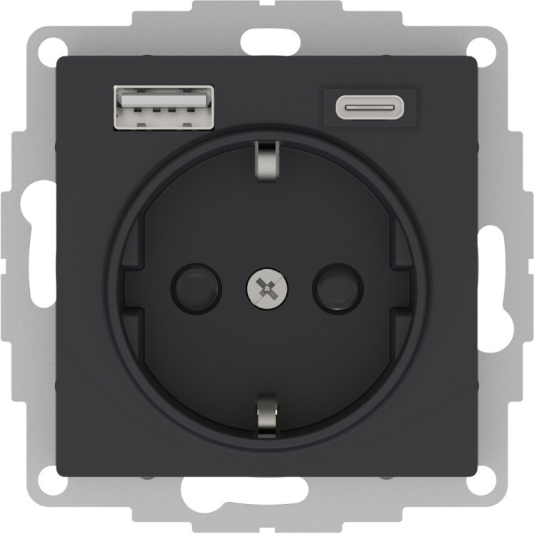 Розетка силовая Systeme Electric (ранее Schneider Electric) серии AtlasDesign 16А (цвет карбон) с заземлением и шторками с розеткой USB, с двумя разъемами тип А и тип С. Розетка совмещает в себе сразу 3 функции в одном изделии. Удобное и современное решение для дома, офиса и других помещений.