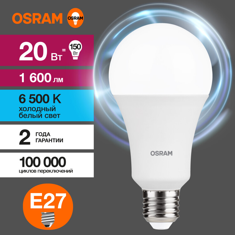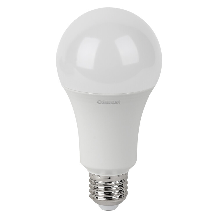 Лампа светодиодная OSRAM LED Value A, 1600лм, 20Вт (замена 150Вт), 6500К (холодный белый свет). Цоколь E27, колба A, угол пучка 180°. Исполнение колбы матовое, пластик. Напряжение питания 220-240В. Товар сертифицирован.