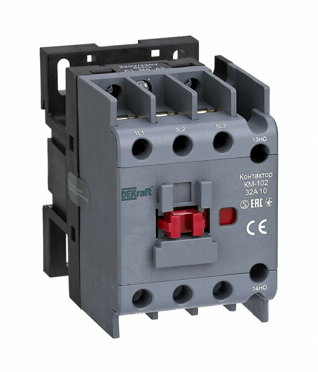 Контактор серии КМ-102 DEKraft; 3P; номинальный ток - 32 А (AC3, AC4); напряжение управления 220 В пер.тока; доп.контакты 1НО; установка на стандартную DIN-рейку. Контакторы КМ-102 предназначены для пуска и останова асинхронных двигателей, для коммутации осветительных сетей и конденсаторных батарей в сетях напряжением до 690 В пер.тока. Дополнительные защитные крышки исключают попадание пыли внутрь контактора и обеспечивают защиту от случайного прикосновения.