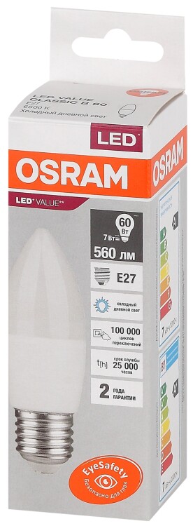 Лампа светодиодная OSRAM LED Value B, 560лм, 7Вт (замена 60Вт), 6500К (холодный белый свет). Цоколь E27, колба B, угол пучка 200. Исполнение колбы матовое, пластик. Напряжение питания 220-240В. Товар сертифицирован.