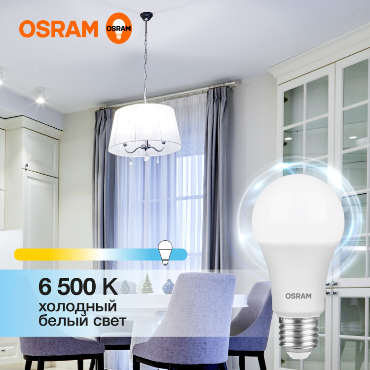 Лампа светодиодная OSRAM LED Value A, 960лм, 12Вт (замена 100Вт), 6500К (холодный белый свет). Цоколь E27, колба A, угол пучка 180. Исполнение колбы матовое, пластик. Напряжение питания 220-240В. Товар сертифицирован.