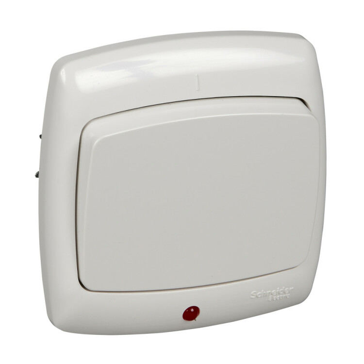 Выключатель одноклавишный Schneider Electric РОНДО (скрытой установки, цвет белый) с подсветкой предназначен для сетей до 250 В, на ток до 6 А.