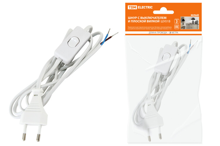 Шнур бра с выключателем и плоской вилкой 2м (ШВВП 2х0,75мм2) белый ШУ01В TDM (1/80шт)