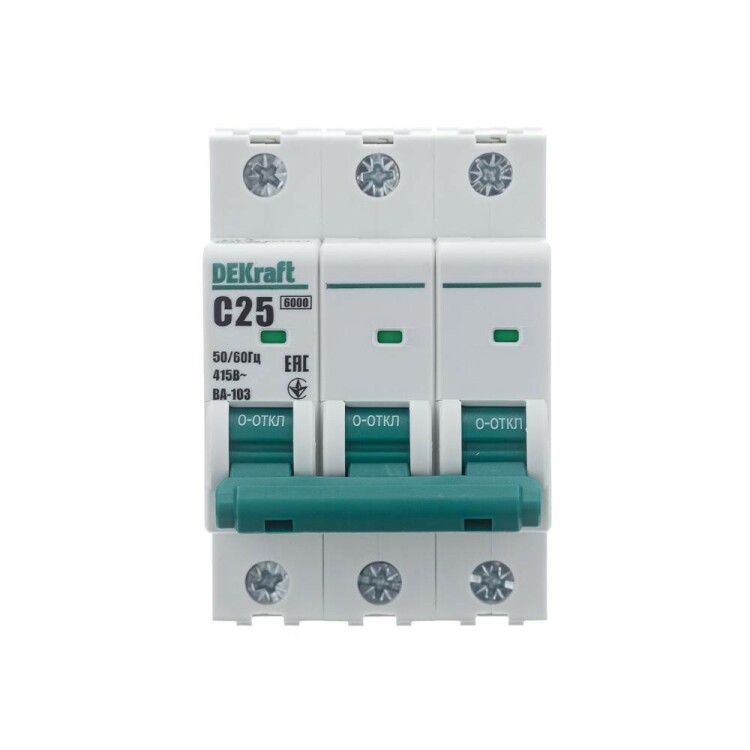 Автоматический выключатель серии ВА-103 NEW DEKraft; 3P; номинальный ток 25 А; характеристика C; отключающая способность 6 кА, что позволяет использовать аппараты в качестве вводных. 5 монолитных заклепок повышают прочность корпуса аппарата. Окошко-индикатор всегда показывает состояние контактов вне зависимости от положения рукоятки управления. Боковые каналы охлаждения повышают стабильность работы при высоких температурах окружающей среды. Есть возможность установки дополнительных аксессуаров с левой стороны устройства. Аппарат на 100% совместим с корпусами и оболочками DEKraft, Systeme Electric.