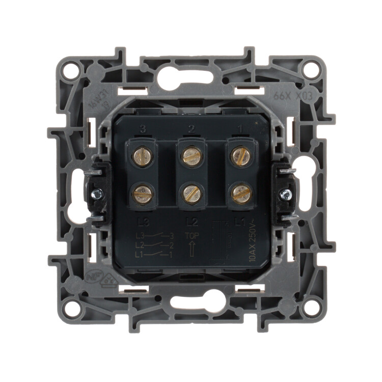 Предназначен для независимого управления тремя нагрузками с одного места. Подходит для управления многорожковыми люстрами и осветительными приборами с большим количеством ламп.