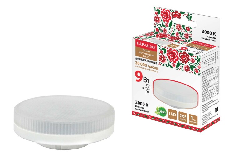 Лампа светодиодная матовая 9 Вт 3000К GX53 ТДМ Народная (10/100шт) снят