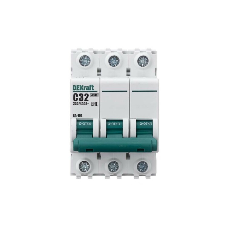 Автоматический выключатель серии ВА-101 Dekraft; 3P; номинальный ток 32 А; характеристика С; отключающая способность 4,5 кА. 5 монолитных заклепок повышают прочность корпуса аппарата. Сплошная лицевая панель обеспечивает безопасность эксплуатации аппарата. Боковые каналы охлаждения повышают стабильность работы при высоких температурах окружающей среды. Есть возможность установки дополнительных аксессуаров с левой стороны устройства. Аппарат на 100% совместим с корпусами Dekraft и Systeme Electric.